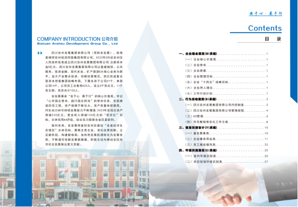 《威廉希尔williamhill系统管理手册》是在吸收、传承、融合威廉希尔williamhill基因的基础上挖掘的新亮点,是对标一流,博采众长的优秀威廉希尔williamhill展示,构建了安州发展集团文化体系的四大识别系统,即企业理念规范(MI系统)、行为活动规范(BI系统)、视觉识别设计(VI系统)、环境识别规范(EI系统)。其中,企业理念规范是安州发展集团文化的价值理念层,由企业核心价值观、使命、愿景、管理目标、“十四五”战略目标、用人理念及三年行动计划组成;行为活动规范为安州发展集团文化的行为规范层,由内控制度、管理规程、8S管理、作风整顿常态化工作方案等行为规范组成;视觉识别设计为安州发展集团文化的物质形象层,由企业标识及其应用规范等组成;环境识别规范为安州发展集团文化的环境形象层,由室内环境及项目现场环境标识及其应用规范等组成。