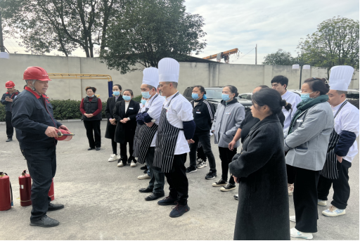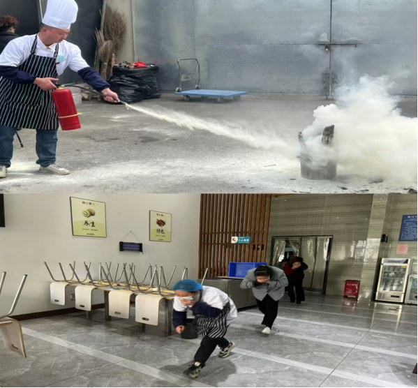 在消防应急演练环节,消防培训机构模拟了食堂突发火情的场景,工作人员在接到火情后,迅速启动消防紧急预案。
