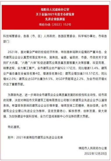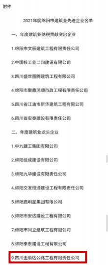 12 月 28 日,绵阳市人民政府办公室通报表扬了一批建 筑企业,金顺达公司获得“绵阳市建筑业先进企业-年度建 筑业龙头企业” 。此次获得行业内市级层面的最高荣誉,既 是对金顺达公司的肯定和认可,更是莫大的鞭策与鼓励。