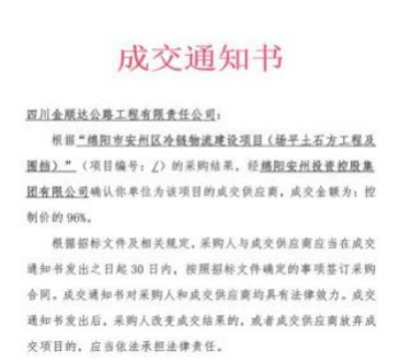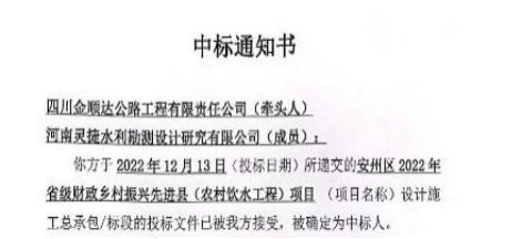 近 日,金顺达公司先后对外投标三次,成功中标三个新 项目,其中包括“安州区 2022 年省级财政乡村振兴先进县 (农村饮水工程)项目、“绵阳市安州区冷链物流建设项目”、 “绵阳市安州区花荄镇安置房配套市政道路。三大项目“连 中三元”,高居榜首,迎来了宏图 (鸿兔) 大展的美好开篇,吹响了新年新征程的号角。