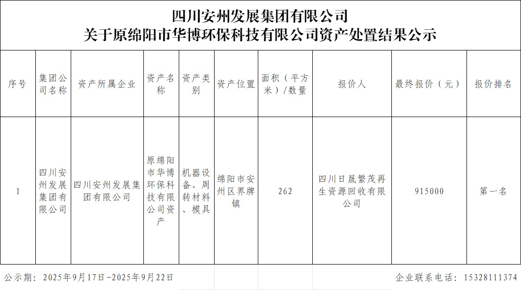 williamhill官网 关于原绵阳市华博环保科技有限公司资产处置结果公示